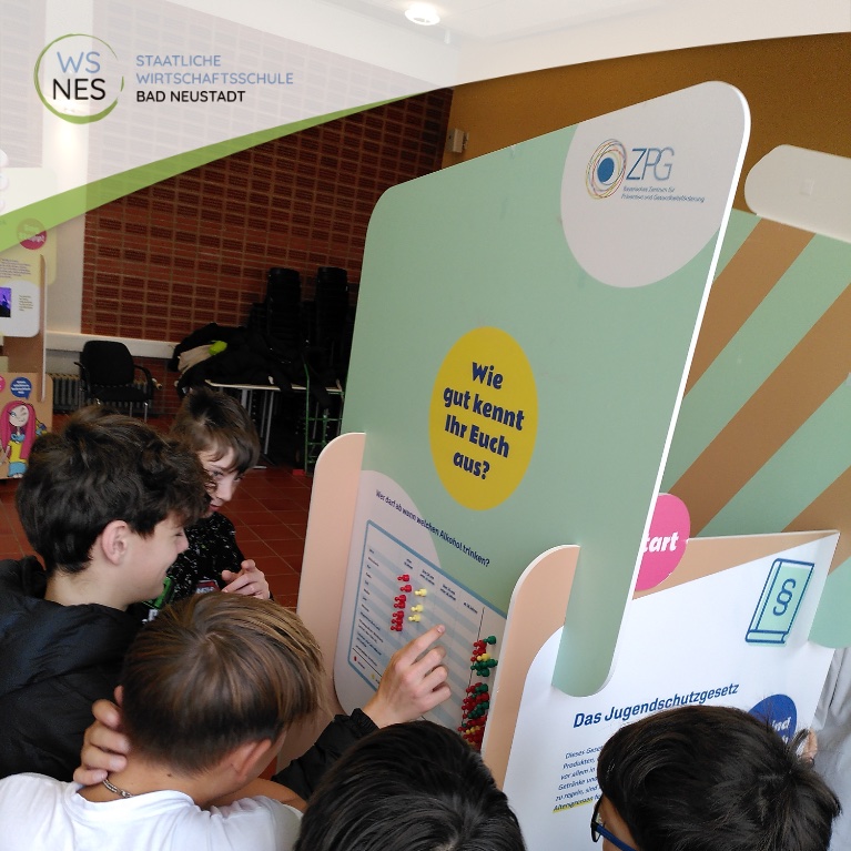 Die Wanderausstellung „Spaß ohne Punkt und Koma“ gastierte vom 20.-30.10.2025 an der Staatlichen Fach- und Berufsoberschule Bad Neustadt a. d. Saale. Das Präventionsangebot will Schülerinnen und Schüler für einen verantwortungsvollen Umgang mit Alkohol sensibilisieren. In einem interaktiven Parcours wurden Wissen, Reflexion und konkrete Handlungsoptionen vermittelt. Ziel war es, Gesundheits- und Risikokompetenz zu stärken, über Wirkungen und Risiken von Alkohol aufzuklären, Strategien gegen Gruppendruck zu trainieren und Basiswissen zu Erster Hilfe sowie Hilfsangeboten zu vermitteln. Ein Dankeschön geht an das Zentrum für Prävention und Gesundheit Bayern und das Gesundheitsamt Rhöngrabfeld für die Organisation und fachliche Begleitung der Ausstellung.