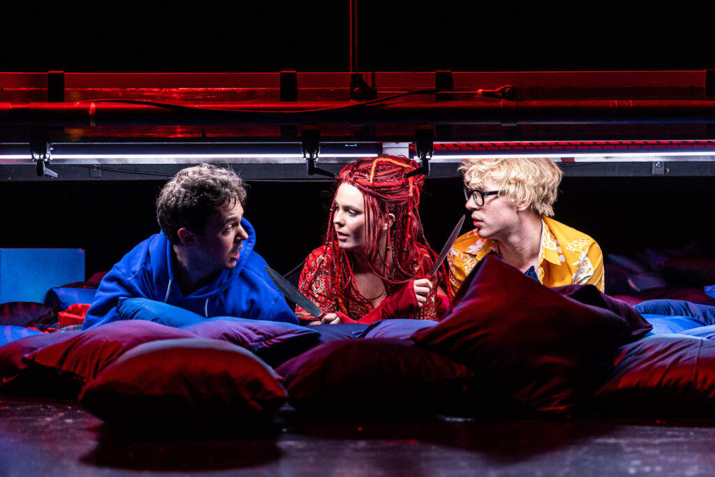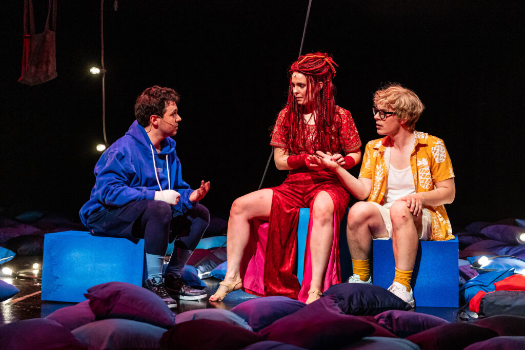 Für viele in den Klassen war dieser Abend die erste Begegnung mit einem modernen Theater in seiner rohen, warmen und unmittelbaren Erzählweise. Für manche Schülerin und manchen Schüler war es sicher auch die erste Erfahrung, dass Bühnenkunst lauter, direkter und emotionaler sein kann als jeder Kinofilm. Für die abstrakte Kulisse aus Kissen und Kisten zeichnete sich der Studiengang Kostüm- und Bühnenbild der Hochschule für Bildende Künste Dresden verantwortlich. Besonders kunstvoll war, wie sich Sprache und das Thema von Tom Odells „Another Love“ in leichter Melancholie ineinander verflochten. Ein Satz führte in einen Song hinein, die Songstrophe wiederum brach ab und ließ eine Figur zurück, die inmitten gesprochener Gedanken allein auf der Bühne stand. Die Songzeilen schafften es mit den Erfahrungen der Figuren zu vibrieren und sich wie ein hypnotischer Teppich über die Szenerie zu legen.