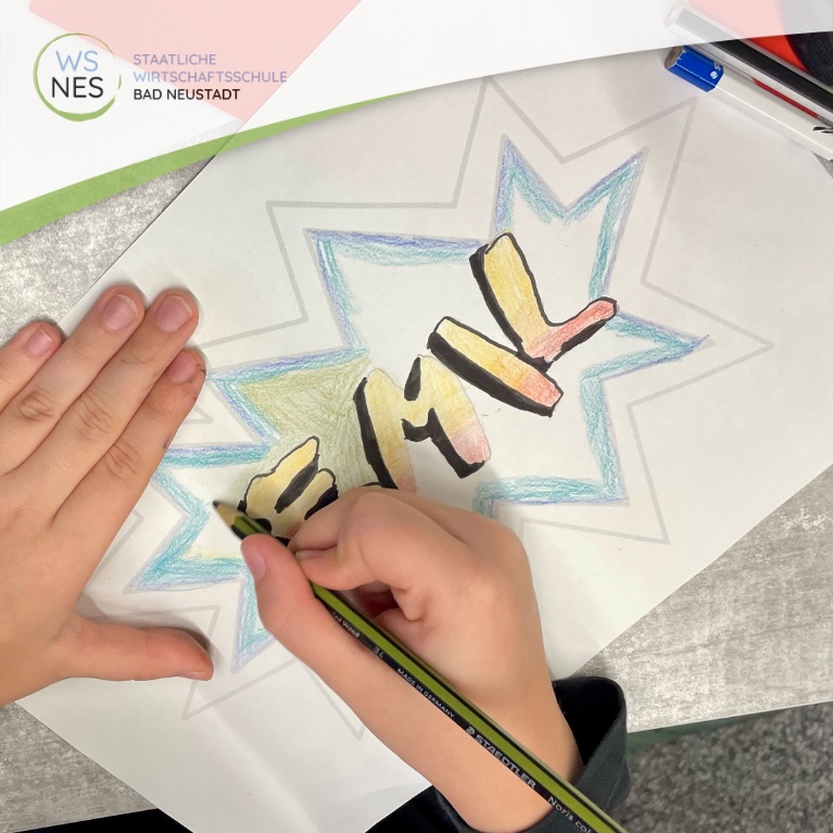 Das Deutschprojekt brachte Elemente der Streetart ins Klassenzimmer: Dieses Kunstprojekt war eine Hommage an eine Kunstform, deren Wurzeln tief in den Straßenschluchten New Yorks der 1960er und 1970er Jahre liegen. Damals begannen Künstlerinnen und Künstler wie TAKI 183 mit Sprühdosen ihre Spuren an Mauern und U-Bahn-Waggons zu hinterlassen. Was als einfaches „Tagging“ begann, entwickelte sich von einer rebellischen Geste zu einer weltweit anerkannten Kunstbewegung mit eigenen Stilen. Einer dieser Stile, die sogenannte Bubble-Schrift, steht bei der Arbeit mit den Schülerinnen und Schülern im Mittelpunkt. Ihre charakteristischen, aufgeblähten Buchstabenformen mit weichen, abgerundeten Kanten verleihen jedem Schriftzug eine dynamische und schwebende Qualität.